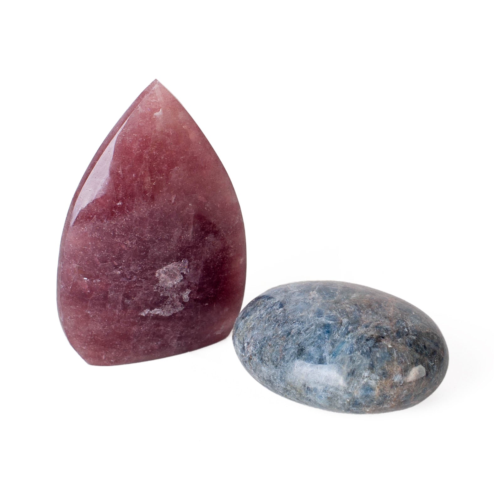 beautifully balanced crystal pairing featuring soothing blue kyanite and warm cherry quartz. The cool, ocean-toned kyanite brings a sense of calm, clarity, and energetic alignment, while the rich blush hues of cherry quartz add warmth, motivation, and heart-centered energy. Together, they create a harmonious contrast of grounding peace and gentle emotional strength.