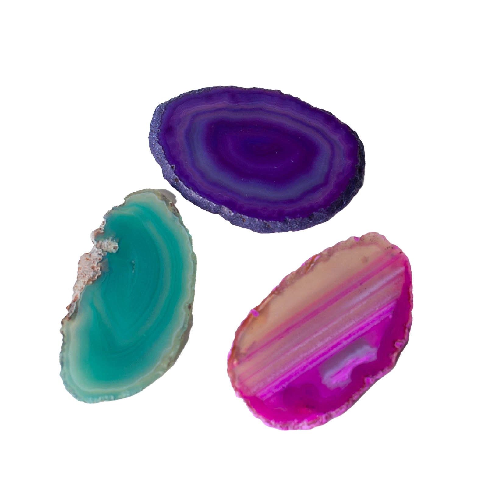 This bundle of dyes agate slices offers a stunning mix of color, pattern, and grounding energy. Each slice is hand-selected for its unique beauty and vibrancy, polished to reveal the intricate bands that make agate so captivating.
